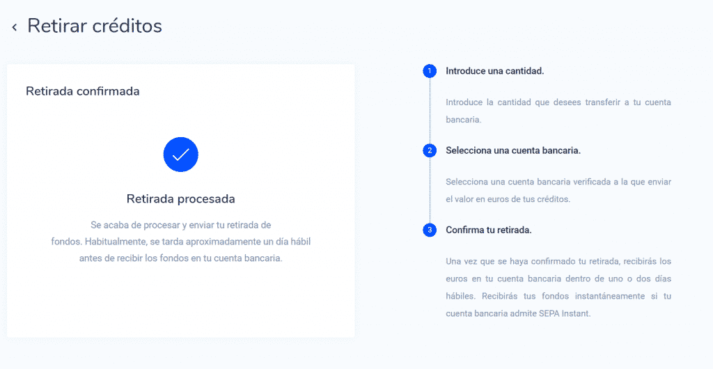 Nuestra experiencia ha sido que la cantidad seleccionada está casi inmediatamente en tu cuenta bancaria si tu banco es compatible con SEPA Instant. De lo contrario, tardará aproximadamente 1 día laborable. No se realizan retiros durante los fines de semana y festivos. Si tienes algún problema, puedes contactar con el servicio de asistencia o contactarnos con tu pregunta.
